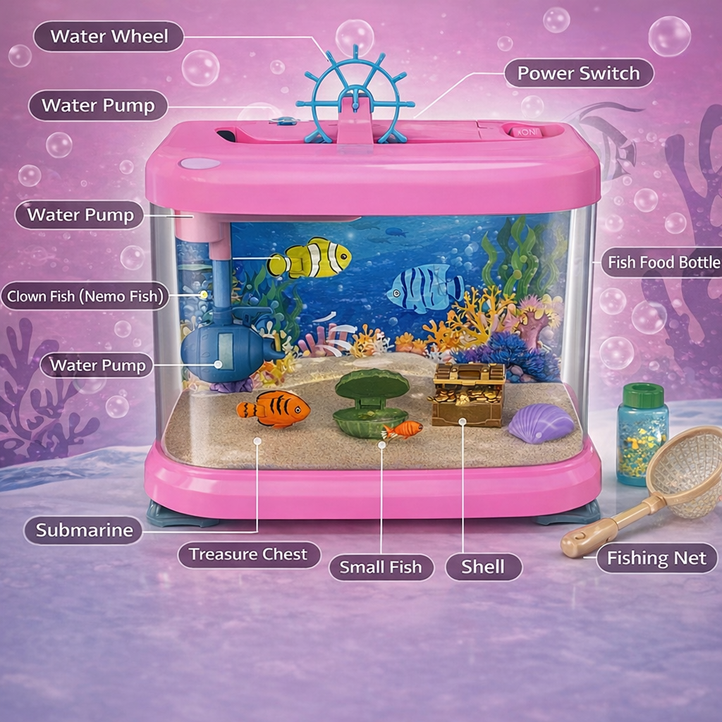 - Realistic Fish Tank Design – Cute mini aquarium with moving fish for engaging play