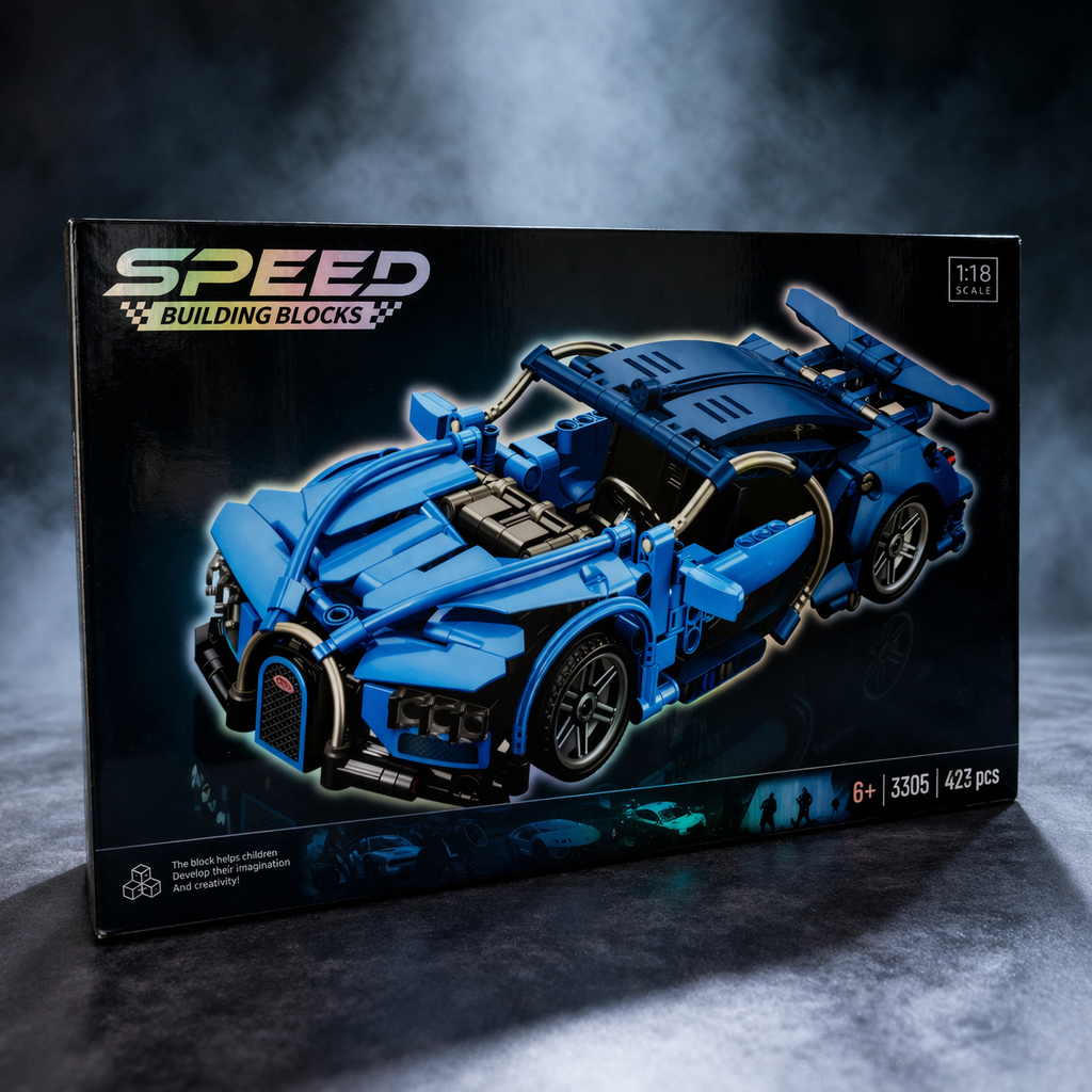 Speed Building Blocks Supercar Set. Designed for young builders and car enthusiasts, this detailed 1:18 scale model offers an exciting hands-on building experience with realistic design and pull-back action.